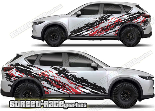 Mazda CX-5 graphics. They are shown on the second generation CX-5 but they can be trimmed to fit all later versions and facelift variants. The decals are not pre-cut for any specific Mazda CX-5 version; they do not have any door handle cutouts, wheel arch or door line splits. These will require trimming during fitting. Vinyl will not stick to unpainted textured plastics.
