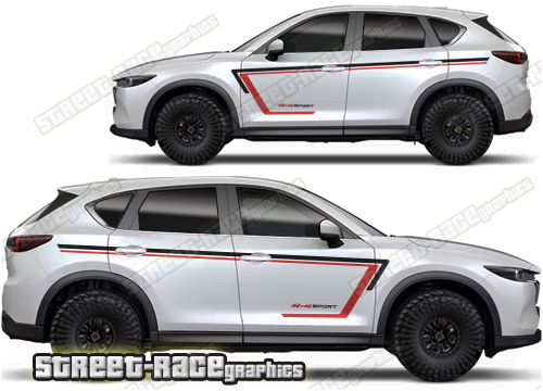 Mazda CX-5 graphics. They are shown on the second generation CX-5 but they can be trimmed to fit all later versions and facelift variants. The decals are not pre-cut for any specific Mazda CX-5 version; they do not have any door handle cutouts, wheel arch or door line splits. These will require trimming during fitting. Vinyl will not stick to unpainted textured plastics.