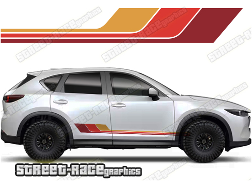 Mazda CX-5 racing stripes. They are shown on the second generation CX-5 but they can be trimmed to fit all later versions and facelift variants. The decals are not pre-cut for any specific Mazda CX-5 version; they do not have any door handle cutouts, wheel arch or door line splits. These will require trimming during fitting. Vinyl will not stick to unpainted textured plastics.