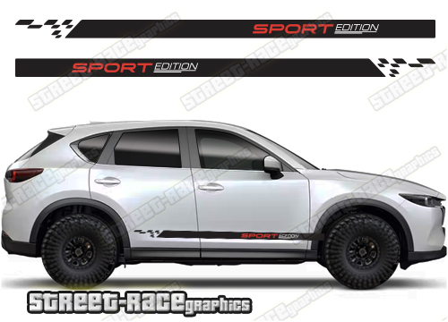 Mazda CX-5 racing stripes. They are shown on the second generation CX-5 but they can be trimmed to fit all later versions and facelift variants. The decals are not pre-cut for any specific Mazda CX-5 version; they do not have any door handle cutouts, wheel arch or door line splits. These will require trimming during fitting. Vinyl will not stick to unpainted textured plastics.