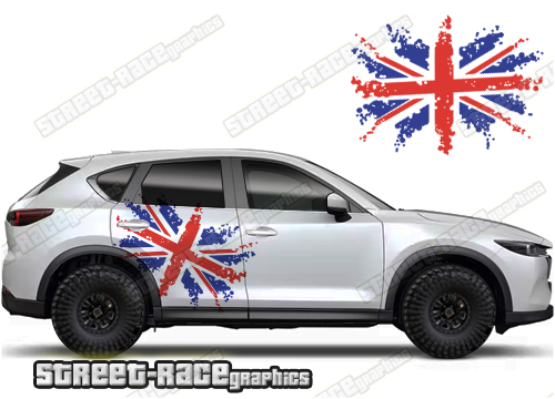Mazda CX-5 graphics. They are shown on the second generation CX-5 but they can be trimmed to fit all later versions and facelift variants. The decals are not pre-cut for any specific Mazda CX-5 version; they do not have any door handle cutouts, wheel arch or door line splits. These will require trimming during fitting. Vinyl will not stick to unpainted textured plastics.