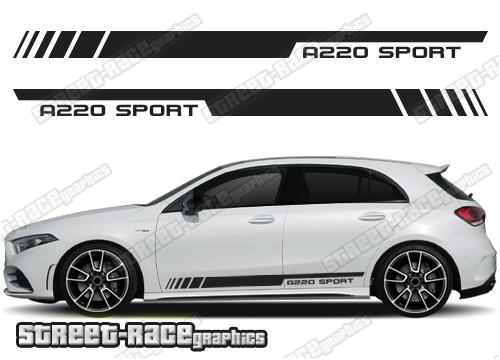 Mercedes A220 motorsport racing stripe graphics. We can change the logo to read A45, A180, A200, A220, B180, B200, B220 etc. Please add a message on the checkout page if you need us to change the lettering.