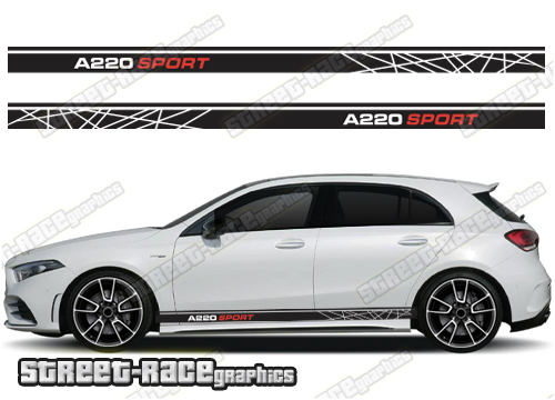 Mercedes SPORT racing stripe graphics. We can change the logo to read A45, A180, A200, A220, B180, B200 or B220. Please add a message on the checkout page if you need us to change the lettering.