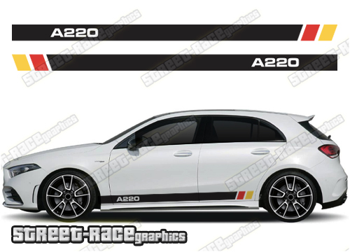 Mercedes A220 motorsport racing stripe graphics. We can change the logo to read A180, A200, A220, B180, B200 or B220. Please add a message on the checkout page if you need us to change the lettering.