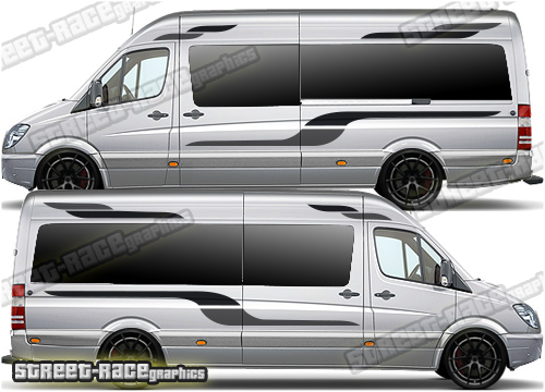 Mercedes Sprinter Campervan / Motorhome graphics kits. These are ideal for giving your existing camper a new look or to finish off a new camper conversion project. They are shown on the L3 (LWB) van with minibus windows. We can also make them to suit the L1 (SWB), L2 (MWB) and L4 (XLWB) vans (choose the wheelbase length from the menu).