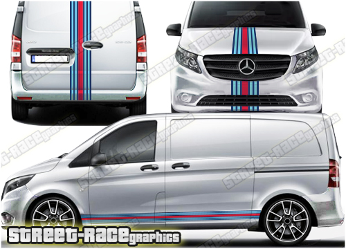 Mercedes Vito Martini style ‘over the top’ OTT and side racing stripe graphics, digitally printed. There are no gaps or clear areas in these Martini graphics, so they can be fitted to any colour van.