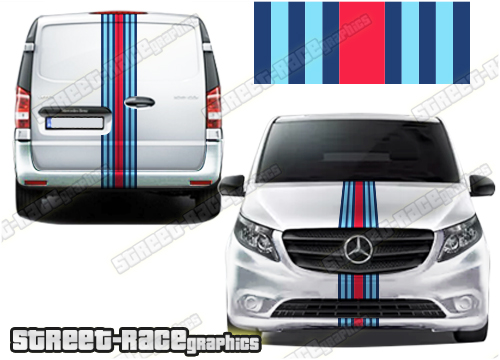 Mercedes Vito Martini style ‘over the top’ OTT and side racing stripe graphics, digitally printed. There are no gaps or clear areas in these Martini graphics, so they can be fitted to any colour van.