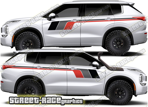 Mitsubishi Outlander graphics. They are shown on the fourth generation Outlander but they can be trimmed to fit any Outlander. The decals are not pre-cut for any specific Mitsubishi Outlander version; they do not have any door handle cutouts, wheel arch or door line splits. These will require trimming during fitting.