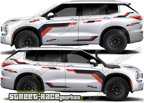 Mitsubishi Outlander graphics. They are shown on the fourth generation Outlander but they can be trimmed to fit any Outlander. The decals are not pre-cut for any specific Mitsubishi Outlander version; they do not have any door handle cutouts, wheel arch or door line splits. These will require trimming during fitting.