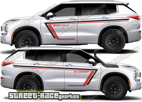 Mitsubishi Outlander graphics. They are shown on the fourth generation Outlander but they can be trimmed to fit any Outlander. The decals are not pre-cut for any specific Mitsubishi Outlander version; they do not have any door handle cutouts, wheel arch or door line splits. These will require trimming during fitting.