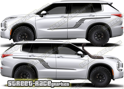 Mitsubishi Outlander graphics. They are shown on the fourth generation Outlander but they can be trimmed to fit any Outlander. The decals are not pre-cut for any specific Mitsubishi Outlander version; they do not have any door handle cutouts, wheel arch or door line splits. These will require trimming during fitting.