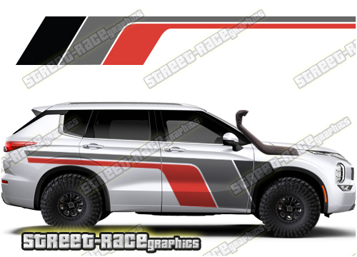 Mitsubishi Outlander graphics. They are shown on the fourth generation Outlander but they can be trimmed to fit any Outlander. The decals are not pre-cut for any specific Mitsubishi Outlander version; they do not have any door handle cutouts, wheel arch cutouts or door line splits. These will require trimming during fitting.