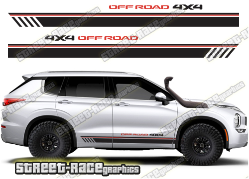 Mitsubishi Outlander racing stripes. They are shown on the fourth generation Outlander but they can be trimmed to fit any Outlander. The decals are not pre-cut for any specific Mitsubishi Outlander version; they do not have any door handle cutouts or door line splits. These will require trimming during fitting.