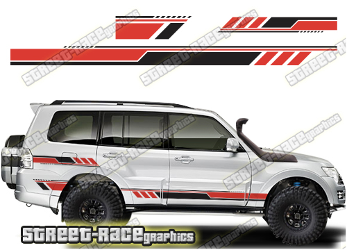 Mitsubishi Shogun / Pajero racing stripes. They are shown on the fourth generation 5 door Shogun but they can be trimmed to fit any 5 door Shogun. The decals are not pre-cut for any specific Shogun / Pajero version; they do not have any door handle cutouts, wheel arch or door line splits. These will require trimming during fitting. Vinyl will not stick to unpainted textured plastic, so the graphics are not suitable for some variants.
