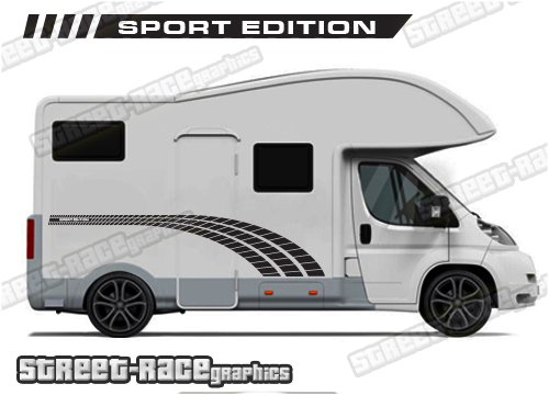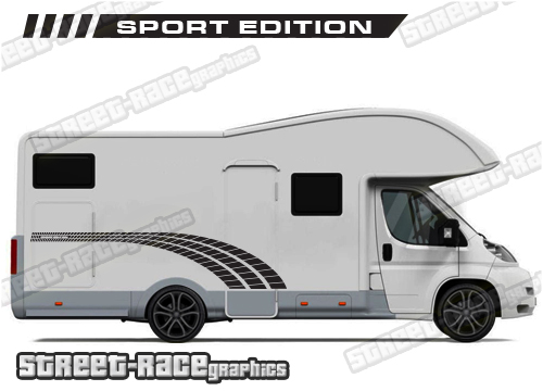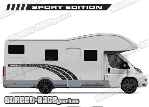 Motorhome graphics kits. These are ideal for giving your existing motorhome a new look or to finish off a restoration project. Shown on a compact 6m van on the first picture. We can also make them to suit the larger 7m and 7.5m vans (shown the second and third pictures) – choose the wheelbase length of your motorhome from the drop-down menus.