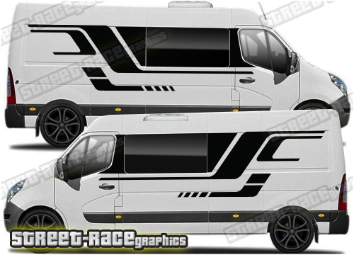 Movano, Master & NV400 campervan graphics kits. These are ideal for giving your existing camper a new look or to finish off a new camper conversion project. They are sized to fit the Vauxhall Movano, Renault Master and Nissan NV400. Shown on the L3 (LWB) van. We can also make them to suit the L1 (SWB) to L4 (XLWB) van (choose the wheelbase length from the menu).