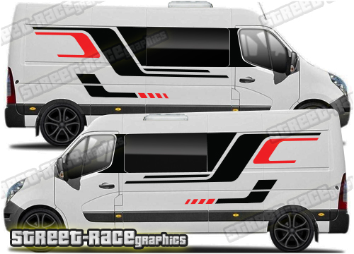 Movano, Master & NV400 campervan graphics kits. These are ideal for giving your existing camper a new look or to finish off a new camper conversion project. They are sized to fit the Vauxhall Movano, Renault Master and Nissan NV400. Shown on the L3 (LWB) van. We can also make them to suit the L1 (SWB) to L4 (XLWB) van (choose the wheelbase length from the menu).