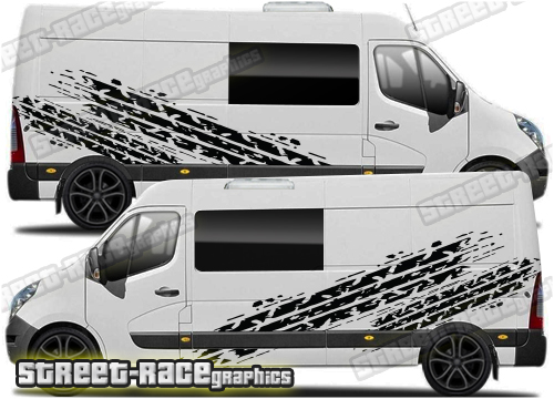 Movano, Master & NV400 campervan graphics kits. These are ideal for giving your existing camper a new look or to finish off a new camper conversion project. They are sized to fit the Vauxhall Movano, Renault Master and Nissan NV400. Shown on the L3 (LWB) van. We can also make them to suit the L1 (SWB) to L4 (XLWB) van (choose the wheelbase length from the menu).
