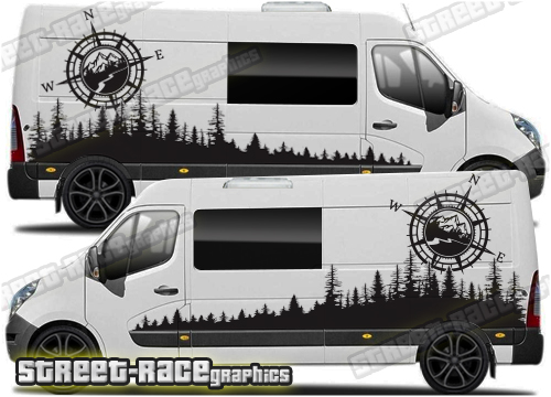 Movano, Master & NV400 campervan graphics kits. These are ideal for giving your existing camper a new look or to finish off a new camper conversion project. They are sized to fit the Vauxhall Movano, Renault Master and Nissan NV400. Shown on the L3 (LWB) van. We can also make them to suit the L1 (SWB) to L4 (XLWB) van (choose the wheelbase length from the menu).