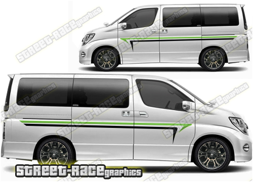Nissan Elgrand graphics. Great for a camper or race van conversion. They are a universal fit to suit all Nissan Elgrand vans and facelift variants from MK1 onwards. There are no cutouts for the wheel arches, door handles or door lines, these will require trimming during fitting.