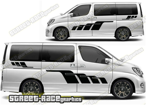 Nissan Elgrand graphics. Great for a camper or race van conversion. They are a universal fit to suit all Nissan Elgrand vans and facelift variants from MK1 onwards. There are no cutouts for the wheel arches, door handles or door lines, these will require trimming during fitting.