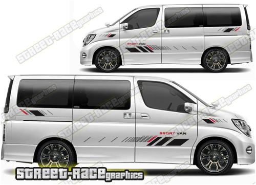 Nissan Elgrand graphics. Great for a camper or race van conversion. They are a universal fit to suit all Nissan Elgrand vans and facelift variants from MK1 onwards. There are no cutouts for the wheel arches, door handles or door lines, these will require trimming during fitting.