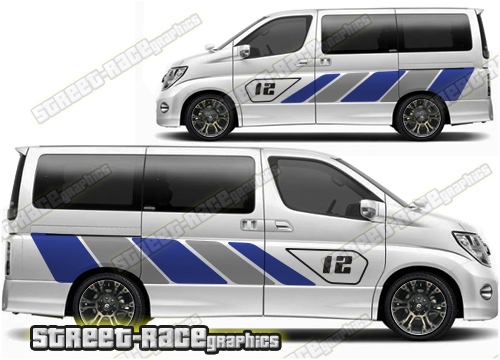 Nissan Elgrand graphics. Great for a camper or race van conversion. They are a universal fit to suit all Nissan Elgrand vans and facelift variants from MK1 onwards. There are no cutouts for the wheel arches, door handles or door lines, these will require trimming during fitting.