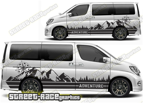 Nissan Elgrand graphics. Great for a camper or race van conversion. They are a universal fit to suit all Nissan Elgrand vans and facelift variants from MK1 onwards. There are no cutouts for the wheel arches, door handles or door lines, these will require trimming during fitting.