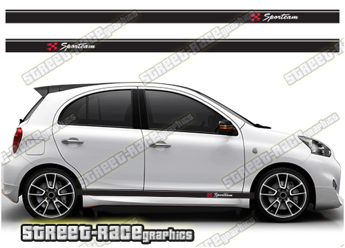 Nissan Micra racing stripes sticker kit from street-race.org. These stripes are a universal fit so they will fit all Nissan Micra cars and facelift variants. They are not pre-cut around the doors or wheel arches so will suit both 2 and 4 door cars.