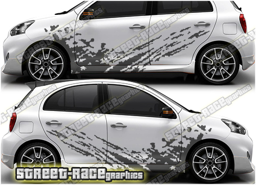 Nissan Micra rally graphics. These graphics are a universal fit so they will fit all Nissan Micra cars and facelift variants. They are not pre-cut around the door lines, handles or wheel arches so will suit both 2 and 4 door cars.