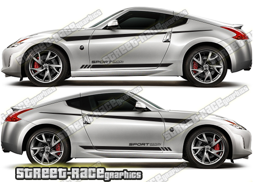 Nissan 350Z & 370Z track-day racing graphics. These decals are a universal fit so they will fit all 350Z & 370Z cars and facelift variants. They are not pre-cut around the door lines, door handles or wheel arches.
