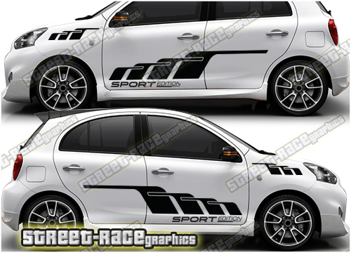 Nissan Micra rally graphics. These graphics are a universal fit so they will fit all Nissan Micra cars and facelift variants. They are not pre-cut around the door lines, handles or wheel arches so will suit both 2 and 4 door cars.