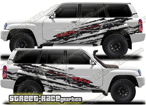 Nissan Patrol graphics. They are shown on the fifth generation Y61 Nissan Patrol but they can be trimmed to fit any Patrol. The decals are not pre-cut for any specific Nissan Patrol version; they do not have any door handle cutouts, wheel arch or door line splits. These will require trimming during fitting.