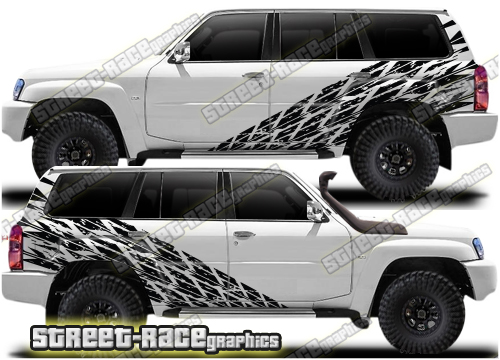 Nissan Patrol graphics. They are shown on the fifth generation Y61 Nissan Patrol but they can be trimmed to fit any Patrol. The decals are not pre-cut for any specific Nissan Patrol version; they do not have any door handle cutouts, wheel arch or door line splits. These will require trimming during fitting.
