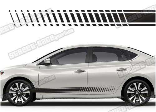 Nissan Sentra racing stripes sticker kit from street-race.org. These stripes are a universal fit so they will fit all Nissan Sentra cars and facelift variants. They are not pre-cut around the doors or wheel arches.