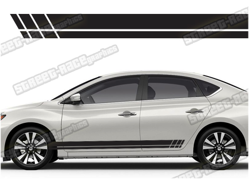 Nissan Sentra racing stripes sticker kit from street-race.org. These stripes are a universal fit so they will fit all Nissan Sentra cars and facelift variants. They are not pre-cut around the doors or wheel arches.