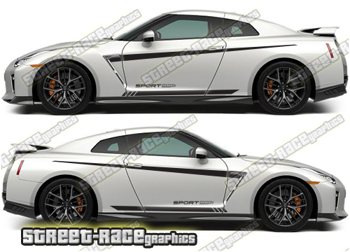 Nissan Skyline track-day racing graphics. These decals are a universal fit so they will fit all Skyline cars and facelift variants. They are not pre-cut around the door lines, door handles or wheel arches.