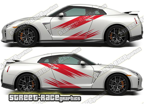 Nissan Skyline track-day racing graphics. These decals are a universal fit so they will fit all Skyline cars and facelift variants. They are not pre-cut around the door lines, door handles or wheel arches.