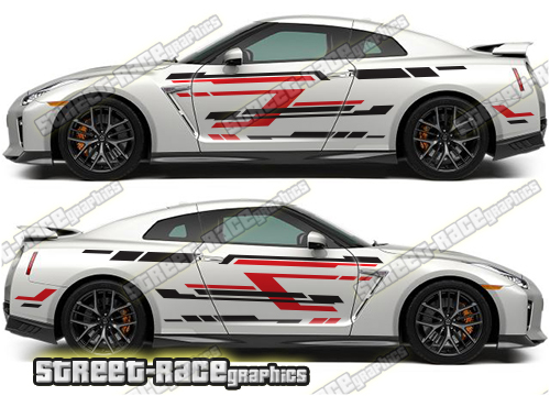 Nissan Skyline track-day racing graphics. These decals are a universal fit so they will fit all Skyline cars and facelift variants. They are not pre-cut around the door lines, door handles or wheel arches.