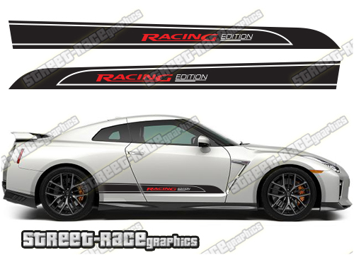 Nissan Skyline racing stripes sticker kit from street-race.org. They are a universal fit so will fit all Nissan Skyline cars and facelift variants. They are not pre-trimmed around the vents, wheel arches or door lines – they will require minor trimming during fitting.