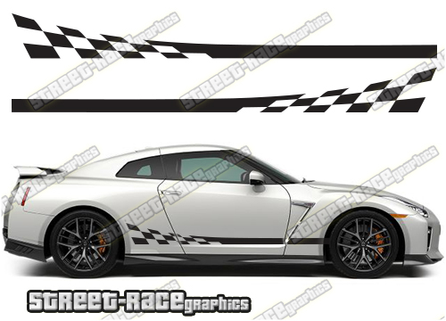 Nissan Skyline racing stripes. They are a universal fit so will fit all Nissan Skyline cars and facelift variants. They are not pre-trimmed around the vents, wheel arches or door lines – they will require minor trimming during fitting.