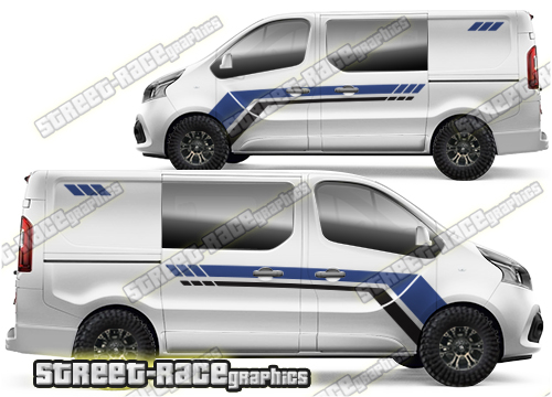 Nissan NV300 / Primastar large side graphics. Great for a camper or race van conversion. They are a universal fit to suit all Nissan NV300 / Primastar vans and facelift variants from MK2 onwards. There are no cutouts for the door handles, wheel arches or door lines, these will require trimming during fitting. Shown on the short wheelbase (SWB) Nissan NV300 van, but we can also make them to fit the long wheelbase (LWB).