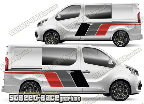 Nissan NV300 / Primastar large side graphics. Great for a camper or race van conversion. They are a universal fit to suit all Nissan NV300 / Primastar vans and facelift variants from MK2 onwards. There are no cutouts for the door handles, wheel arches or door lines, these will require trimming during fitting. Shown on the short wheelbase (SWB) Nissan NV300 van, but we can also make them to fit the long wheelbase (LWB).