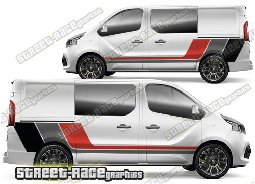 Nissan NV300 / Primastar large side graphics. Great for a camper or race van conversion. They are a universal fit to suit all Nissan NV300 / Primastar vans and facelift variants from MK2 onwards. There are no cutouts for the door handles, wheel arches or door lines, these will require trimming during fitting. Shown on the short wheelbase (SWB) Nissan NV300 van, but we can also make them to fit the long wheelbase (LWB).