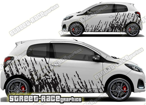 Peugeot 107 & 108 graphics. These large race-inspired decals are perfect for both street, rally and track-day cars. They are a universal fit to suit all Peugeot 107 & 108 cars and facelift variants from MK1 onwards. There are no cutouts for the door handles, wheel arches or door lines; these will require trimming during fitting.