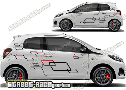 Peugeot 107 & 108 graphics. These large race-inspired decals are perfect for both street, rally and track-day cars. They are a universal fit to suit all Peugeot 107 & 108 cars and facelift variants from MK1 onwards. There are no cutouts for the door handles, wheel arches or door lines; these will require trimming during fitting.