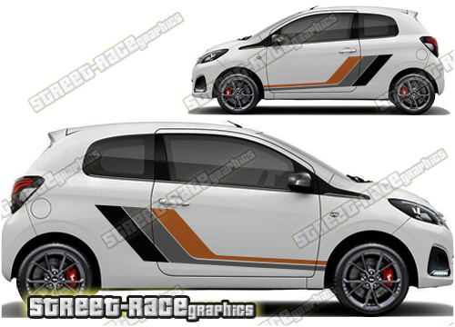 Peugeot 107 & 108 graphics. These large race-inspired decals are perfect for both street, rally and track-day cars. They are a universal fit to suit all Peugeot 107 & 108 cars and facelift variants from MK1 onwards. There are no cutouts for the door handles, wheel arches or door lines; these will require trimming during fitting.