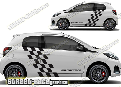 Peugeot 107 & 108 graphics. These large race-inspired decals are perfect for both street, rally and track-day cars. They are a universal fit to suit all Peugeot 107 & 108 cars and facelift variants from MK1 onwards. There are no cutouts for the door handles, wheel arches or door lines; these will require trimming during fitting.