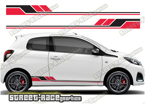 Peugeot 108 racing stripes. They are a universal fit to suit all Peugeot 108 cars and facelift variants from MK1 onwards. There are no cutouts for the wheel arches or door lines; these will require trimming during fitting.