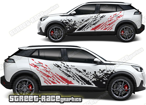 Peugeot 2008 graphics. They are shown on the first generation 2008 but they can be trimmed to fit all later versions and facelift variants. The decals are not pre-cut for any specific Peugeot 2008 version; they do not have any door handle cutouts, wheel arch or door line splits. These will require trimming during fitting. Vinyl will not stick to unpainted textured plastics.